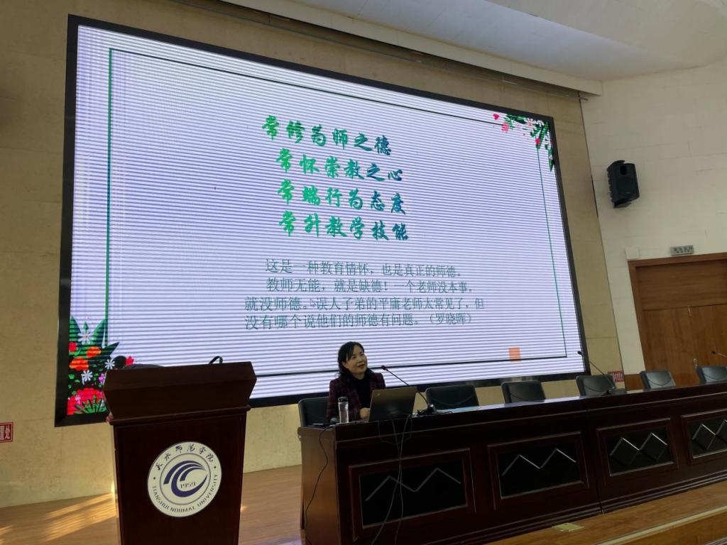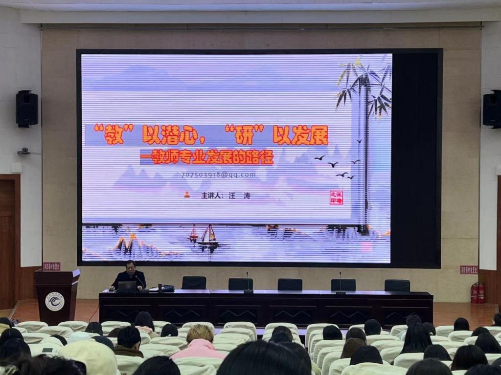 1月4日下午和晚上,甘肃省陇原名师、甘肃省特级教师、天水市第六中学原副校长、天水师范学院兼职硕士生导师汪涛作了“新时代·新语文·新课堂·新教法”和“教以潜心,研以成长”的专题讲座。汪涛老师结合新课标讨论了语文教学的热点问题和前沿理论,阐述了自己的观点,为同学们厘清了教学思路。