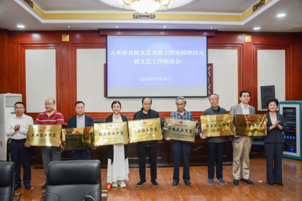 2024年9月26日下午,“天水市首批文艺名家工作室授牌仪式暨文艺工作座谈会”在市政府常务会议室举行。天水市文联主席张铖宣读《天水市文学艺术界联合会关于命名天水市首批文艺名家工作室的决定》,随后天水市委常委、宣传部长王文东,天水市副市长汪小娟,为文艺名家工作室授牌。