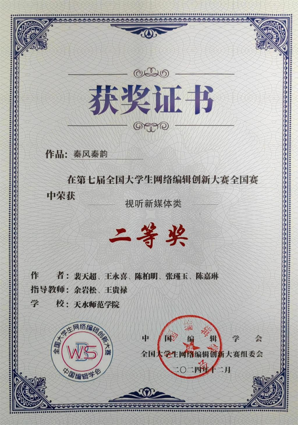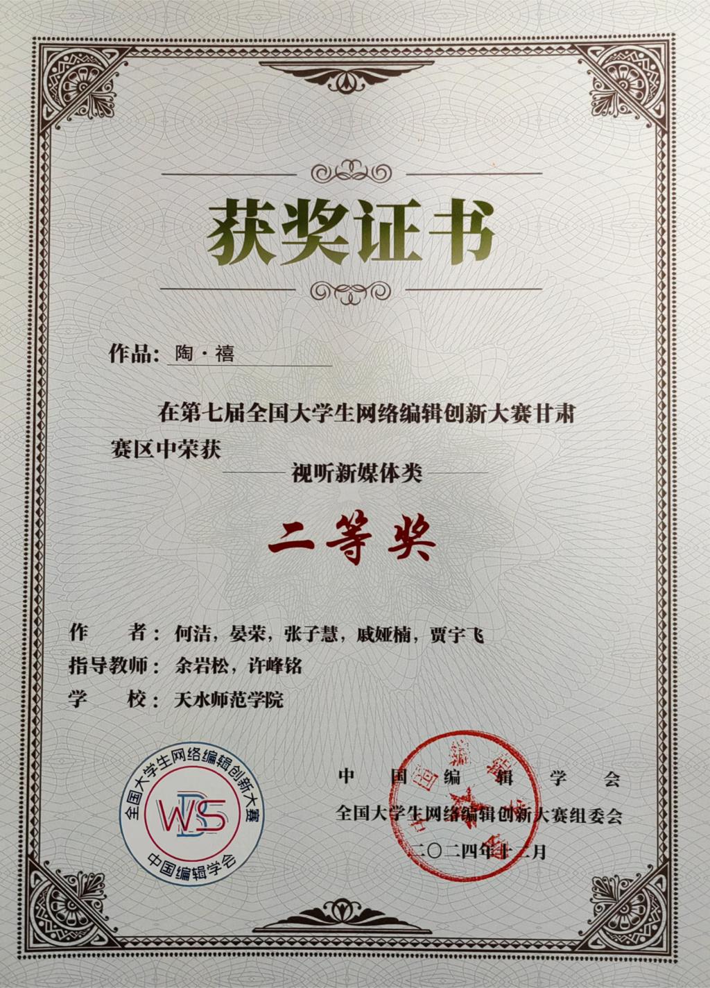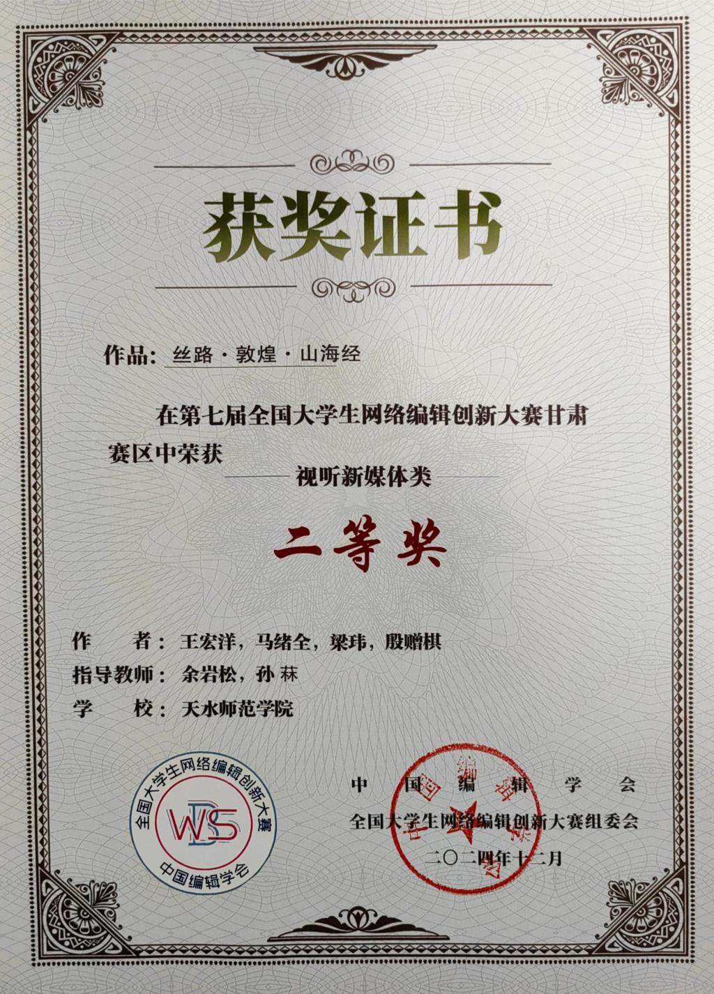 在开云kaiyun官方网站王贵禄教授及余岩松、许峰铭、程琦、孙菻等教师的指导下,2021级戏剧影视文学专业及网络与新媒体专业裴天超、王永喜、陈柏明等同学,跨专业联合拍摄的纪录片《秦风秦韵》,获得第七届全国大学生网络编辑创新大赛全国赛“视听媒体类”二等奖;2021级戏剧影视文学专业何洁、晏荣等同学拍摄的纪录片《陶·禧》;2022级网络与新媒体专业王宏洋、马绪全等同学创作的创意短视频《丝路·敦煌·山海经》获得甘肃赛区“视听媒体”类二等奖,2021级戏剧影视文学专业张带霞、陈婷婷等拍摄的纪录片《焰舞长空,古今共鸣》荣获三等奖。