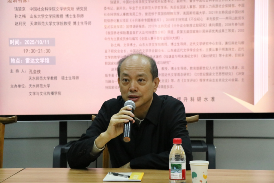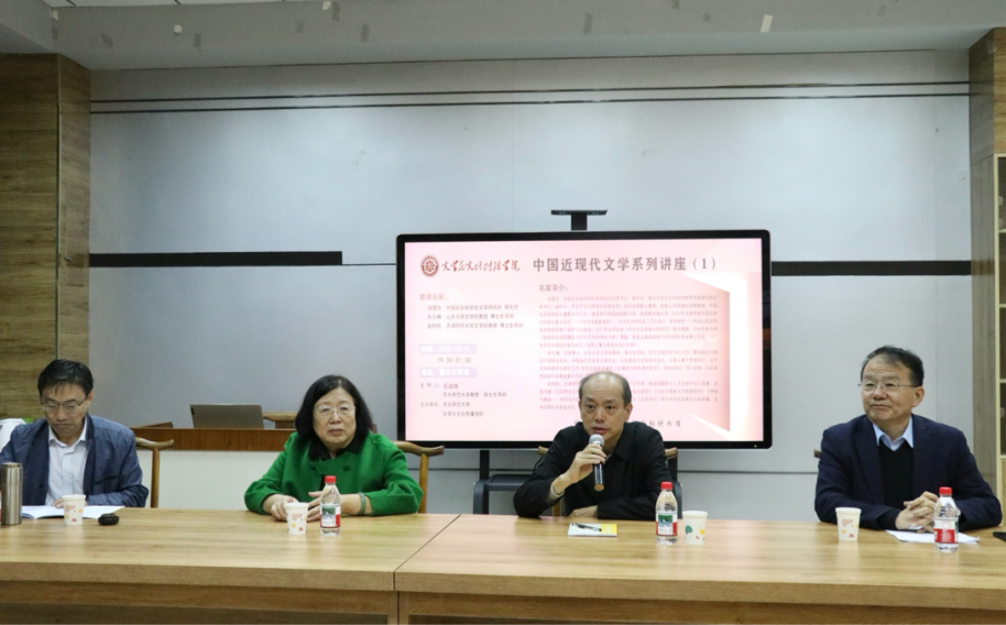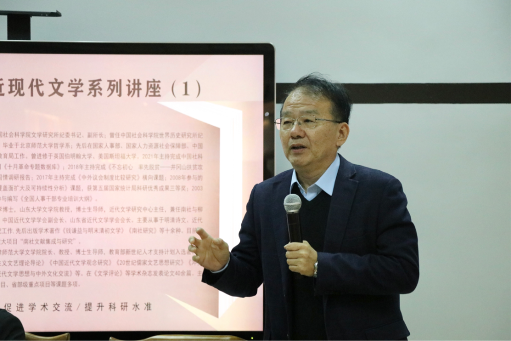 10月11日晚19:00,开云kaiyun官方网站开云kaiyun官方网站在雷达文学馆举办中国近现代文学系列讲座(一)。中国社会科学院文学研究所纪委书记、副所长饶望京,山东大学文学院教授、博士生导师孙之梅,中国近代文学学会副会长、华南师范大学教授、博士生导师左鹏军,天津师范大学文学院院长、教授、博士生导师赵利民向现场师生作了发言。本次讲座由文学与文化传播学院孔会侠教授主持,现当代文学、古代文学专业2023级、2024级研究生参加。