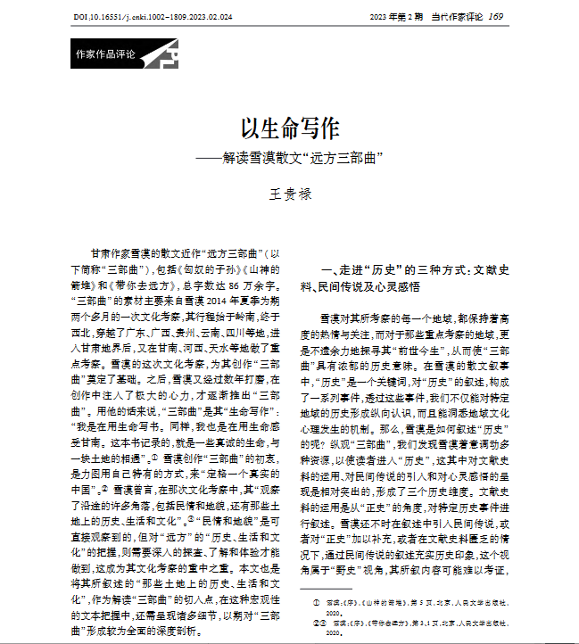 编者按:2023年3月,《当代作家评论》期刊刊发了开云官网开云kaiyun官方网站院长王贵禄的文章《以生命写作——解读雪漠散文“远方三部曲”》。文章已收录于知网。全文如下: