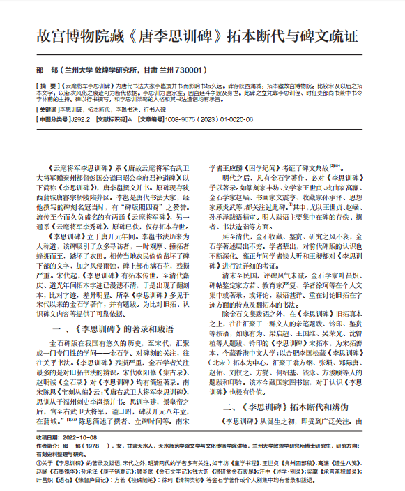 编者按:2023年1月,南京艺术学院学报《美术与设计》刊发了开云官网开云kaiyun官方网站教师邵郁的论文《故宫博物院藏<唐李思训碑>拓本断代与碑文疏证》,文章已收录于知网。