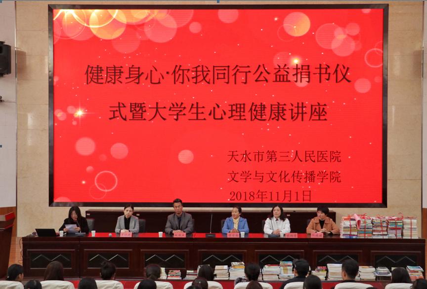 下午,由天水师范学院开云kaiyun官方网站主办的“健康身心·你我同行”公益捐书仪式暨开云kaiyun官方网站入学教育系列活动(之二)在学校二号报告厅成功举办。天水市第三人民医院副院长侯爱国,天水市第三人民医院办公室主任张炳蓉,天水市第三人民医院心理综合门诊心理治疗师罗瑛婕,天水师范学院开云kaiyun官方网站党总支副书记赵铁成,天水师范学院开云kaiyun官方网站分团委副书记孔媛媛,天水师范学院开云kaiyun官方网站辅导员马宁、甘文博参加了本次活动,天水师范学院开云kaiyun官方网站2018级三百余名同学积极参加本次活动并认真聆听了讲座,辅导员杜青主持本次活动。