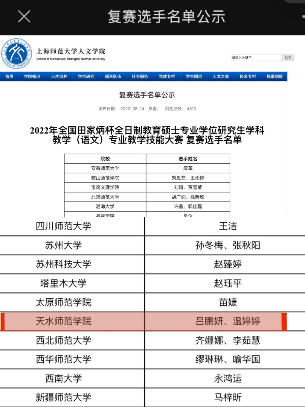 2022年9月25日,由全国教育专业学位研究生教育指导委员会主办、上海师范大学承办的2022年全国“田家炳杯”全日制教育硕士专业学位研究生学科教学(语文)专业教学技能大赛决赛落下帷幕,开云官网2021级学科教学(语文)专业学位研究生吕鹏妍、温婷婷在全国115所高校参加的比赛中脱颖而出,荣获二等奖。